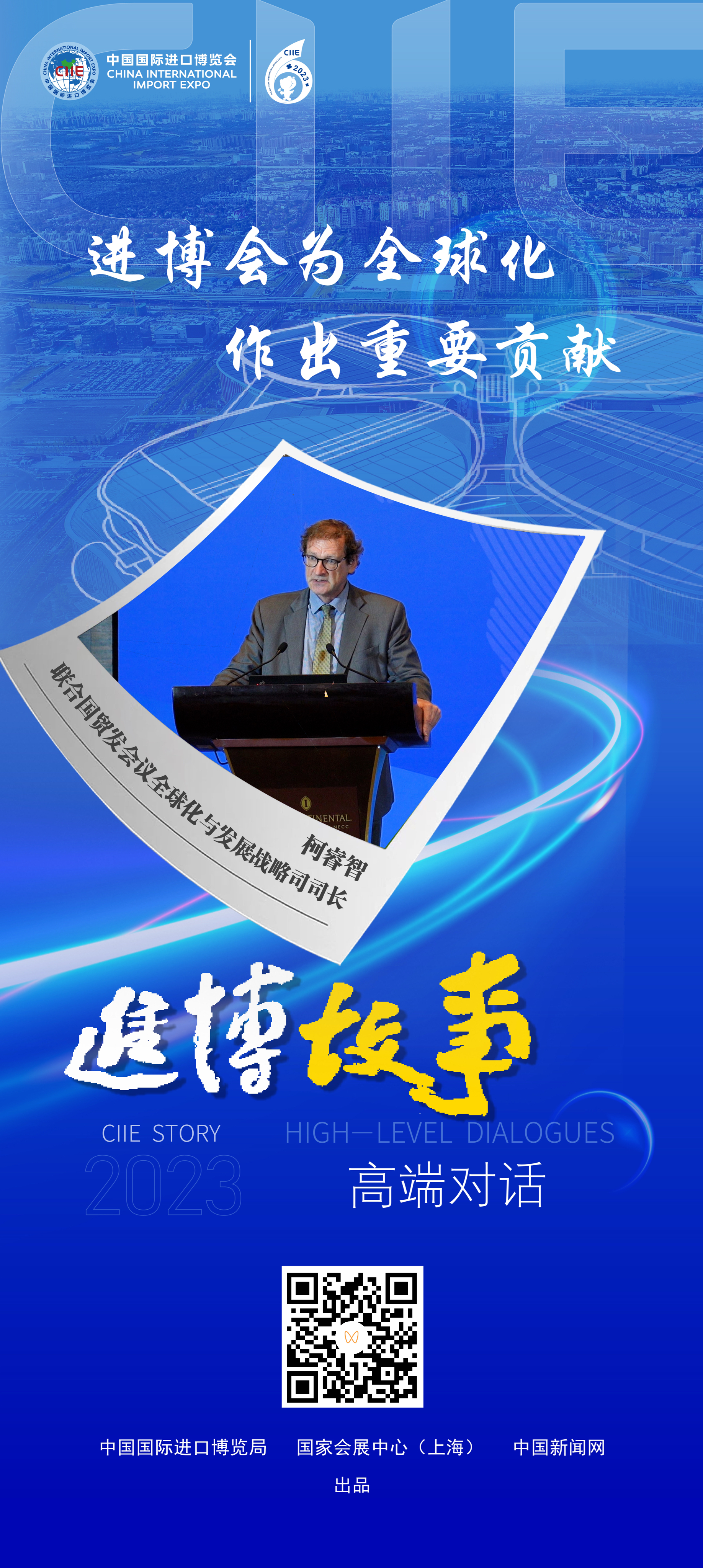 ?。ㄟM(jìn)博故事·高端對(duì)話)專訪聯(lián)合國貿(mào)發(fā)會(huì)議全球化與發(fā)展戰(zhàn)略司司長(zhǎng)柯睿智:進(jìn)博會(huì)為全球化作出重要貢獻(xiàn)主題海報(bào)