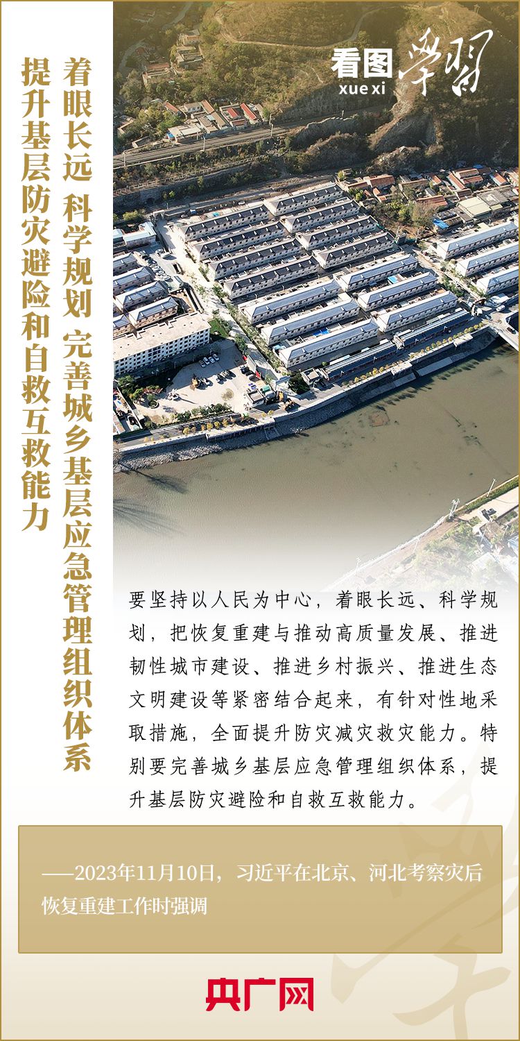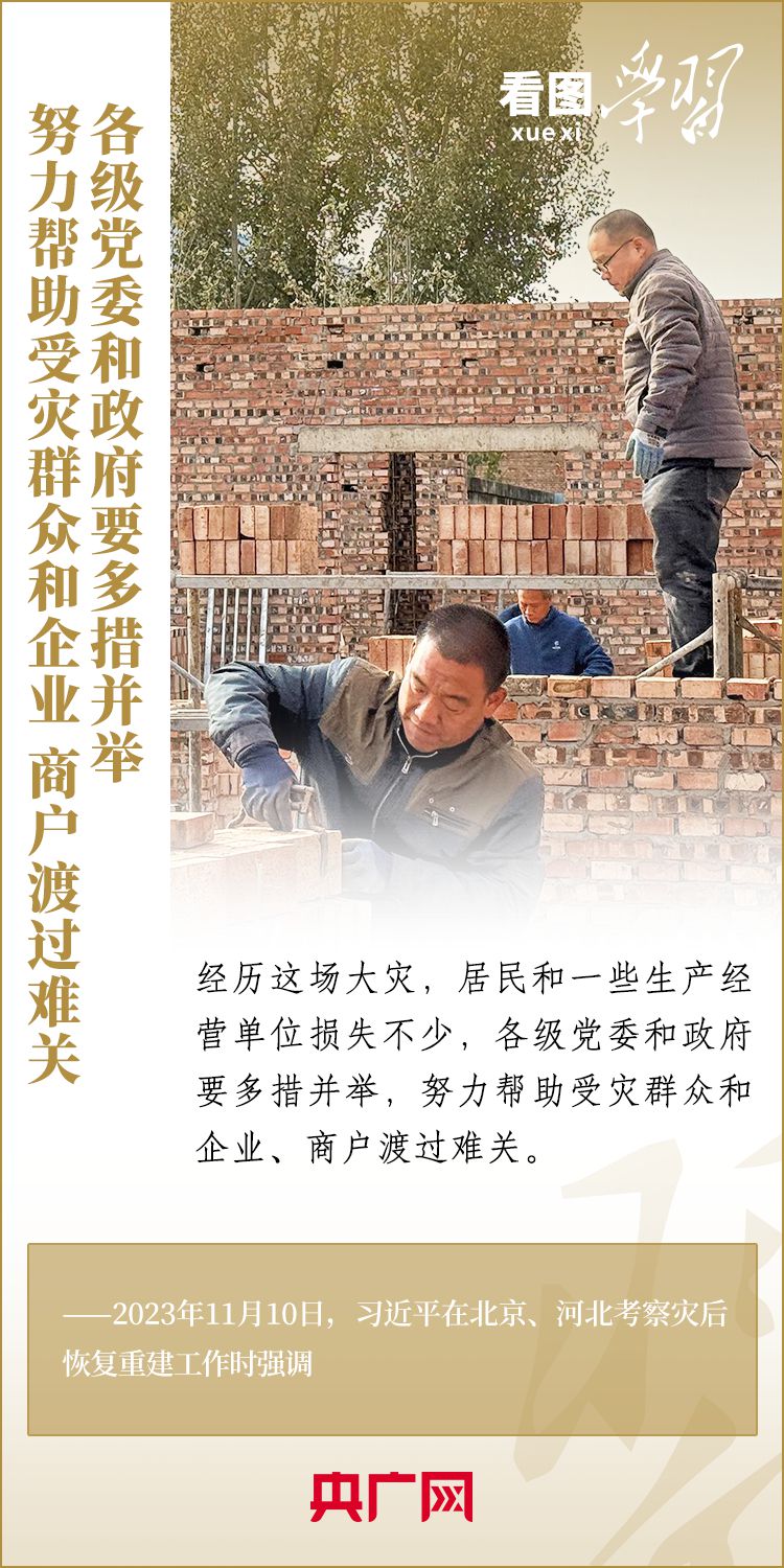 11月10日,習近平總書記在北京、河北考察災后恢復重建工作??倳浬钊雽W校、社區(qū)、村莊、水利工程工地,實地察看村容村貌,了解基礎(chǔ)設(shè)施恢復建設(shè)提升等情況,要求有關(guān)部門堅持以人民為中心,堅持系統(tǒng)觀念,著眼長遠、科學規(guī)劃,把恢復重建與推動高質(zhì)量發(fā)展、推進韌性城市建設(shè)、推進鄉(xiāng)村振興、推進生態(tài)文明建設(shè)等緊密結(jié)合起來,有針對性地采取措施,再接再厲抓好災后恢復重建,確保廣大人民群眾安居樂業(yè)、溫暖過冬。