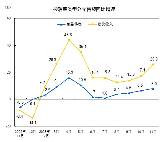 按消費(fèi)類(lèi)型分,11月份,商品零售36925億元,同比增長(zhǎng)8.0%;餐飲收入5580億元,增長(zhǎng)25.8%。1—11月份,商品零售380460億元,同比增長(zhǎng)5.9%;餐飲收入47485億元,增長(zhǎng)19.4%。