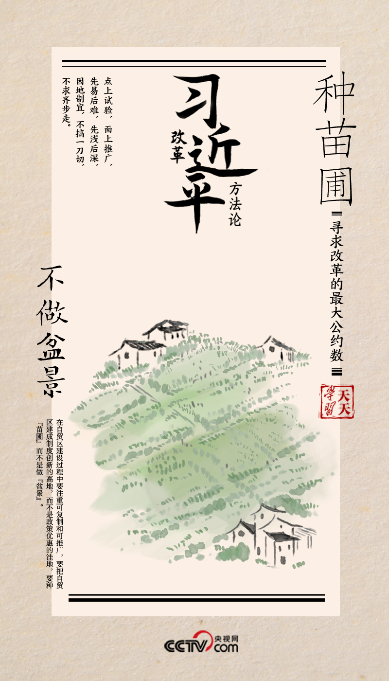 “要種‘苗圃’而不是做‘盆景’”,正是習近平對改革試點方法論的形象比喻和精辟總結(jié)。而正定縣農(nóng)村研究所和上海自貿(mào)試驗區(qū),都是對這一方法論的生動實踐。
