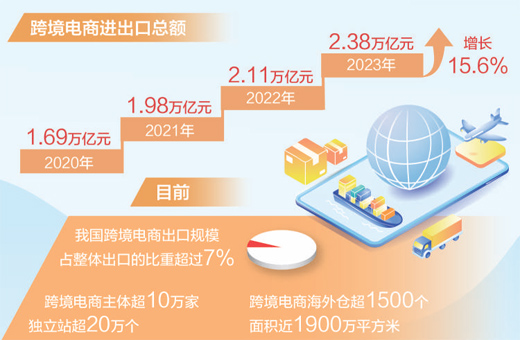 據(jù)海關(guān)測(cè)算,2023年,我國(guó)跨境電商進(jìn)出口總額2.38萬(wàn)億元,增長(zhǎng)15.6%。其中,出口1.83萬(wàn)億元,增長(zhǎng)19.6%;進(jìn)口5483億元,增長(zhǎng)3.9%??缇畴娚炭焖侔l(fā)展,既滿足了國(guó)內(nèi)消費(fèi)者多樣化個(gè)性化需求,又助力我國(guó)產(chǎn)品通達(dá)全球,成為外貿(mào)發(fā)展的重要?jiǎng)幽堋?/p>