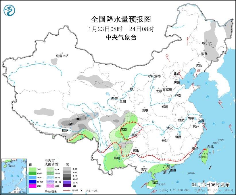 1月25日08時至26日08時,西藏東部、青海南部、甘肅南部、川西高原北部、四川南部、貴州西部、云南東北部和西北部等地部分地區(qū)有小到中雪或雨夾雪。云南大部、貴州西南部等地部分地區(qū)有小到中雨(見圖5)。