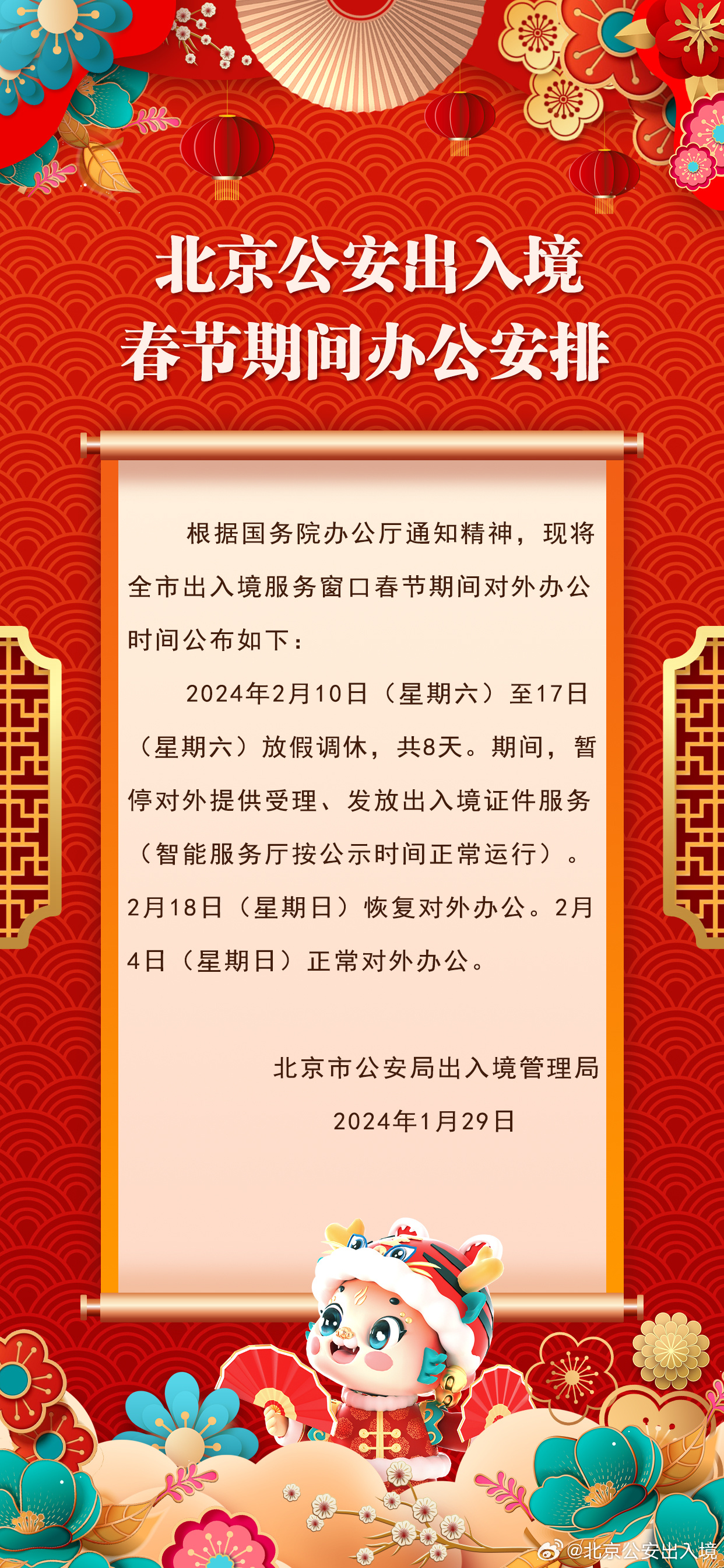 北京市公安局出入境管理局:大年初一到初八暫停對(duì)外辦公
