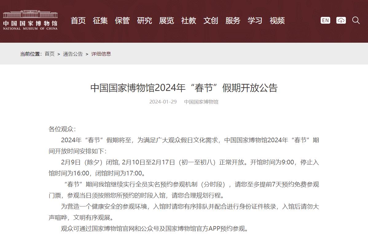 中國(guó)國(guó)家博物館:除夕閉館,初一至初八正常開(kāi)放