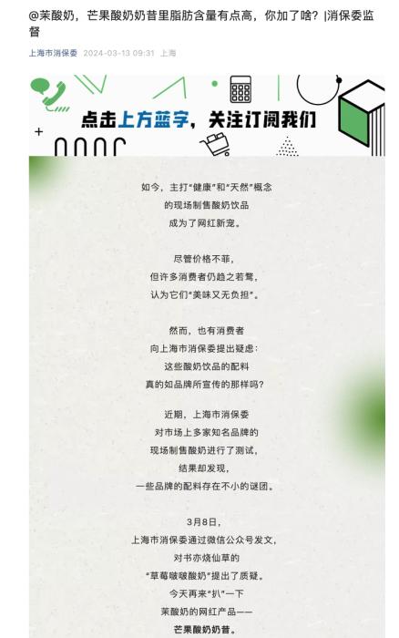 上海市消保委點(diǎn)名茉酸奶 質(zhì)疑芒果酸奶奶昔成分