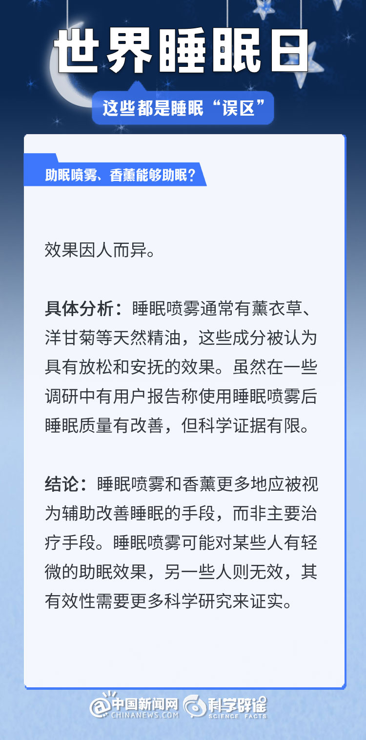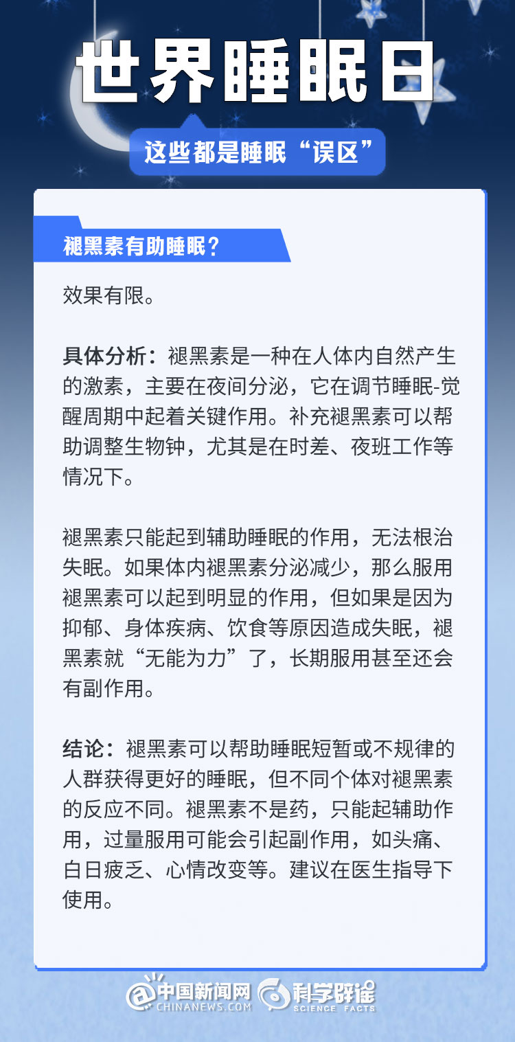 中新網(wǎng)3月21日電 《中國(guó)睡眠研究報(bào)告(2024)》顯示,2023年居民睡眠指數(shù)為62.61分,較2022年降低了5.16。去年的報(bào)告中,曾有近半數(shù)民眾每晚平均睡眠時(shí)長(zhǎng)不足8小時(shí)(47.55%)。很多人正在經(jīng)受著睡眠問題的困擾,為了避免大家被誤導(dǎo),我們總結(jié)了幾個(gè)生活中常見的睡眠誤區(qū),一起來了解一下吧!(來源:科學(xué)辟謠 中國(guó)新聞網(wǎng)微博)