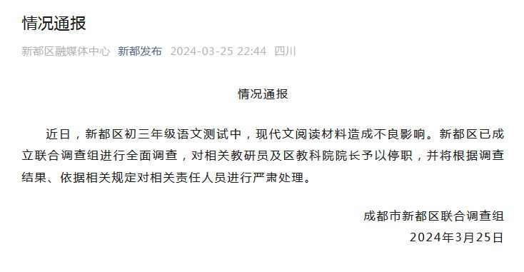初三語文測試閱讀材料造成不良影響 成都新都發(fā)通報(bào)