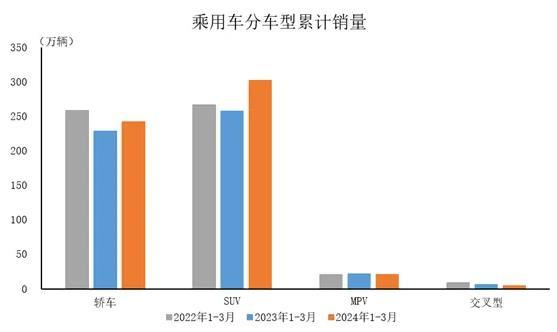 2024年1-3月,在乘用車(chē)主要品種中,與上年同期相比,運(yùn)動(dòng)型多用途乘用車(chē)(SUV)產(chǎn)銷(xiāo)呈兩位數(shù)增長(zhǎng),基本型乘用車(chē)(轎車(chē))產(chǎn)銷(xiāo)小幅增長(zhǎng),多功能乘用車(chē)(MPV)和交叉型乘用車(chē)產(chǎn)銷(xiāo)呈不同程度下降。