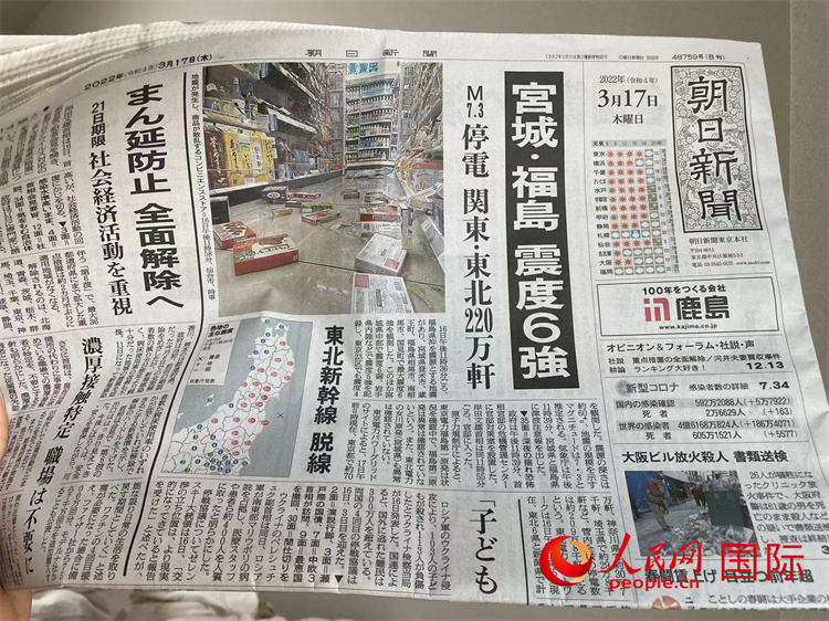 3月17日,日本《朝日新聞》在頭版頭條大篇幅刊登了地震報道。人民網(wǎng) 吳穎攝