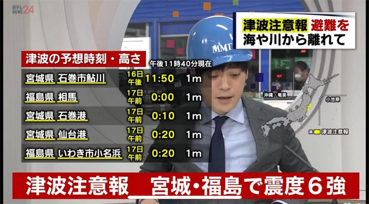 3月16日日本福島縣海域發(fā)生7.4級地震,當(dāng)?shù)匕l(fā)出海嘯警報。圖片來源:日本新聞報道截圖