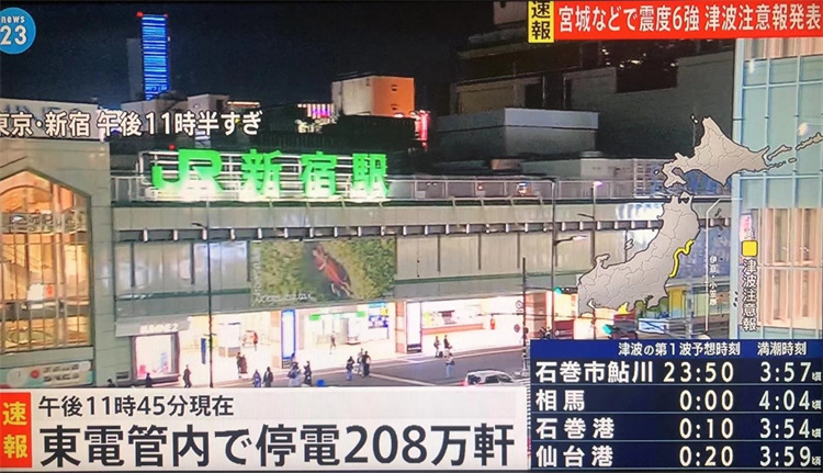3月16日日本福島縣海域發(fā)生7.4級地震,導(dǎo)致大規(guī)模停電。圖片來源:日本電視臺報道截圖