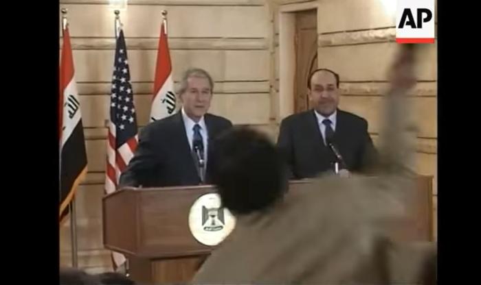 2008年12月,時任美國總統(tǒng)小布什在伊拉克首都巴格達的新聞發(fā)布會上,被伊拉克記者蒙塔達爾·扎伊迪扔鞋。圖片來源:路透社視頻截圖
