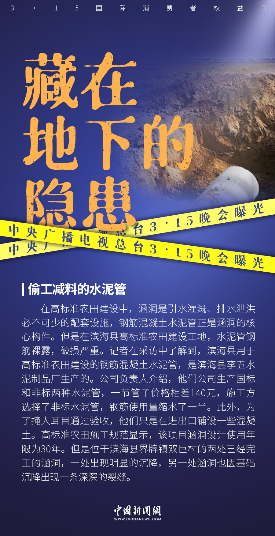 晚會曝光江蘇省鹽城市濱??h高標準農田的地下漏洞,用于建設的鋼筋混凝土水泥管存在偷工減料問題。施工方選擇了非標水泥管,鋼筋使用量縮水了一半。中新財經記者從鹽城市場監(jiān)管局獲悉,工作人員已經行動,后續(xù)信息會及時對外公布。