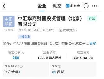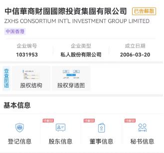 中新財(cái)經(jīng)還以“華商財(cái)團(tuán)”為關(guān)鍵詞通過企查查APP進(jìn)行搜索,出現(xiàn)“中匯華商財(cái)團(tuán)投資管理(北京)有限公司”、“中信華商財(cái)團(tuán)國際投資集團(tuán)有限公司”兩項(xiàng)最為相關(guān)的結(jié)果。前者為注冊資本1000萬元人民幣的小微企業(yè),后者則被標(biāo)注“已告解散”。