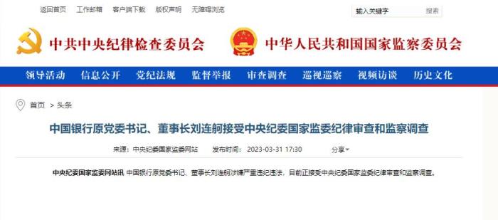 據(jù)中央紀(jì)委國家監(jiān)委網(wǎng)站3月31日消息,中國銀行原黨委書記、董事長劉連舸涉嫌嚴(yán)重違紀(jì)違法,目前正接受中央紀(jì)委國家監(jiān)委紀(jì)律審查和監(jiān)察調(diào)查。