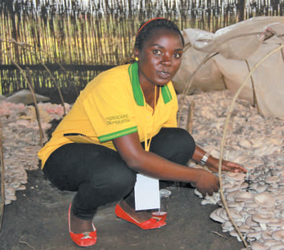 盧旺達國立大學的學生姍臺在菇棚中采收平菇。