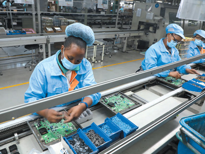 當?shù)貑T工在海信南非工業(yè)園的零配件生產車間裝配電機。