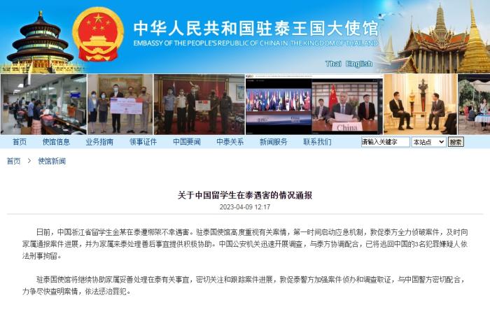 日前,中國浙江省留學(xué)生金某在泰遭綁架不幸遇害。駐泰國使館高度重視有關(guān)案情,第一時間啟動應(yīng)急機制,敦促泰方全力偵破案件,及時向家屬通報案件進展,并為家屬來泰處理善后事宜提供積極協(xié)助。中國公安機關(guān)迅速開展調(diào)查,與泰方協(xié)調(diào)配合,已將逃回中國的3名犯罪嫌疑人依法刑事拘留。
