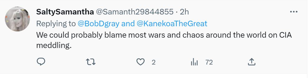 網(wǎng)友“有趣的薩曼莎”說:“世界上絕大多數(shù)的戰(zhàn)爭和混亂都是美國中央情報(bào)局帶來的吧?!?/p>