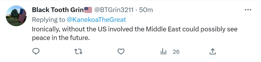 一名自我介紹是美國退役軍人的網(wǎng)友“現(xiàn)身說法”:“真諷刺,沒有美國摻和,中東或許未來就會實(shí)現(xiàn)和平。