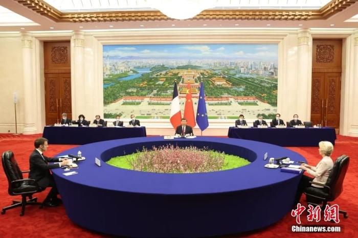 4月6日下午,中國國家主席習近平在北京人民大會堂同法國總統(tǒng)馬克龍、歐盟委員會主席馮德萊恩舉行中法歐三方會晤。中新社記者 盛佳鵬 攝