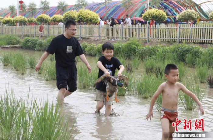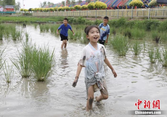 孩子在稻漁空間嬉戲。楊迪 攝