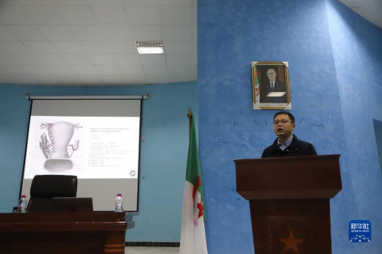 3月7日,在阿爾及利亞塞提夫婦幼醫(yī)院,中國援阿醫(yī)療隊醫(yī)生朱濤為當(dāng)?shù)刈≡横t(yī)師、醫(yī)學(xué)院學(xué)生等做講座。新華社發(fā)(中國援阿醫(yī)療隊供圖)