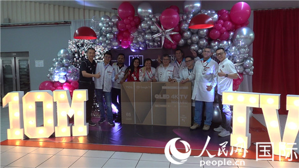中巴員工利用午飯空閑時(shí)間一起紀(jì)念第1000萬(wàn)臺(tái)電視機(jī)下線(xiàn)。人民網(wǎng)記者吳杰 攝