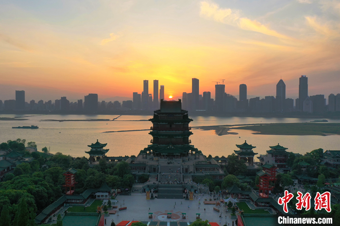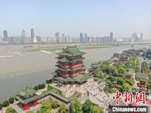 圖為2021年5月2日, 位于江西南昌贛江之畔的江南名樓滕王閣迎來眾多游客。(無人機照片) 中新社記者 劉占昆 攝