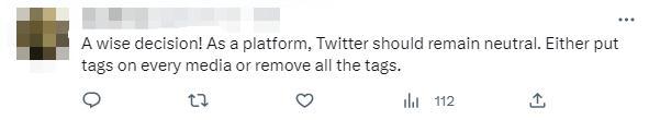 對推特的最新變化,有網(wǎng)友表示歡迎?!耙粋€明智的決定!作為一個平臺,推特應(yīng)該保持中立。要么給每個媒體上都打標(biāo)簽,要么刪除所有標(biāo)簽?!?/p>