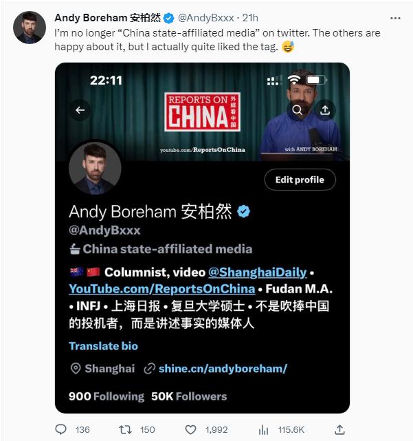 在上海工作生活了近10年的新西蘭媒體人安柏然寫道,“我不再是推特上的‘中國官方媒體’了。其他人對此很高興,但我其實很喜歡這個標(biāo)簽?!?/p>