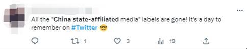 有網(wǎng)友稱,“所有‘中國官方媒體’的標(biāo)簽都消失了!這是推特上值得紀(jì)念的一天?!?/p>