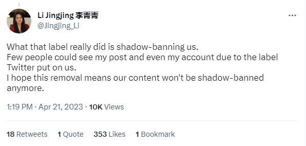 中國英文主持人李菁菁指出,推特的“官媒”標(biāo)簽實際是一種“影子禁令”,為暗中設(shè)限提供方便?!坝捎谕铺亟o我們貼上了標(biāo)簽,很少有人能看到我的帖子,甚至很難找到我的賬號。我希望這次刪除(標(biāo)簽)意味著我們發(fā)布的內(nèi)容不會再被暗中禁止?!?/p>