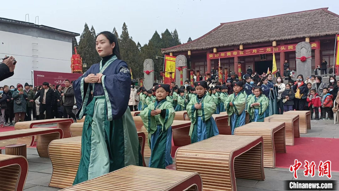 2023年2月,河南省鄭州新密市軒轅小學(xué)三十余名新生在黃帝宮參加開(kāi)筆禮。司向東 攝