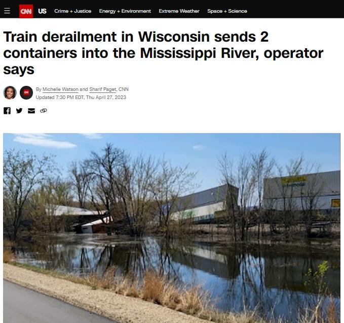 中新網(wǎng)4月28日電 據(jù)美國(guó)有線電視新聞網(wǎng)(CNN)報(bào)道,當(dāng)?shù)貢r(shí)間27日,一列火車(chē)在美國(guó)威斯康星州西南部脫軌,多節(jié)車(chē)廂掉入附近的密西西比河。
