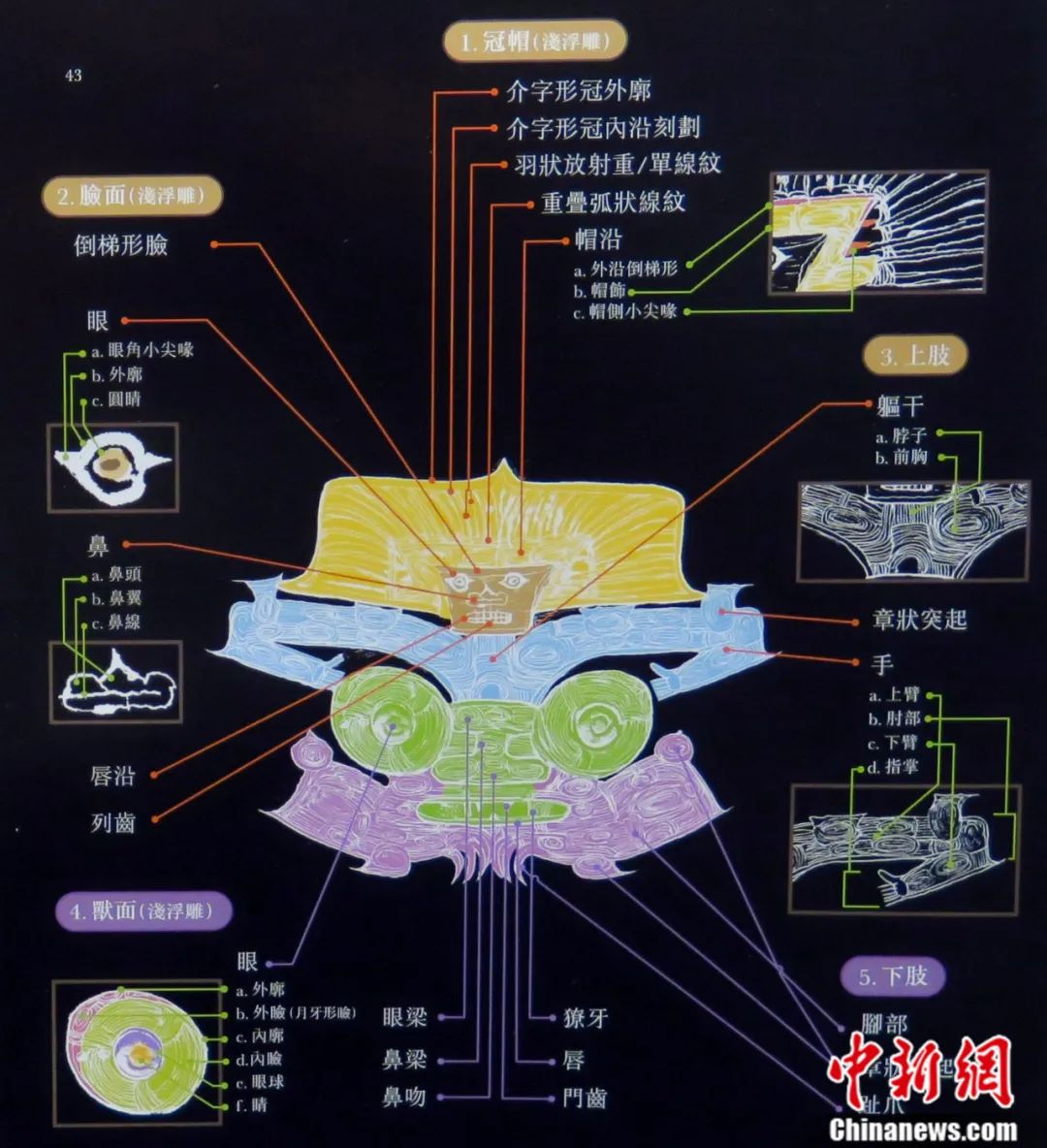 這個圖案的主體為“神人”,面部呈倒梯形,眼睛、鼻子、牙齒都非常寫實?!吧袢恕鳖^上還戴有高聳的羽冠,內(nèi)層刻有連續(xù)卷云紋的帽飾,外層為放射狀羽翎大冠?!吧袢恕钡乃闹家躁幖y細(xì)刻而成,上肢作抬臂、彎肘狀,五指平張?!吧袢恕钡纳硐率且恢环诘厣系纳瘾F(形似老虎),外框有橢圓形的眼瞼,之間以橋形凸面相連,有鼻梁和鼻翼,闊嘴內(nèi)有尖利的牙齒。