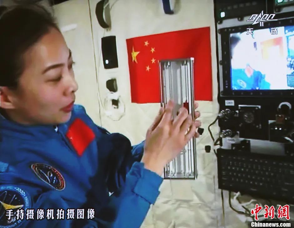 2013年6月20日10時許,神舟十號航天員在天宮一號開展基礎物理實驗,為青少年進行中國首次太空授課。圖為王亞平講授質(zhì)量測量。中新社發(fā) 秦憲安 攝
