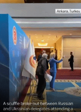 中新網5月5月電 綜合外媒報道,當地時間4日,在土耳其安卡拉舉行的黑海經濟合作組織議會大會(PABSEC)會議間隙,俄烏代表團成員因為一面烏克蘭國旗扭打在了一起。