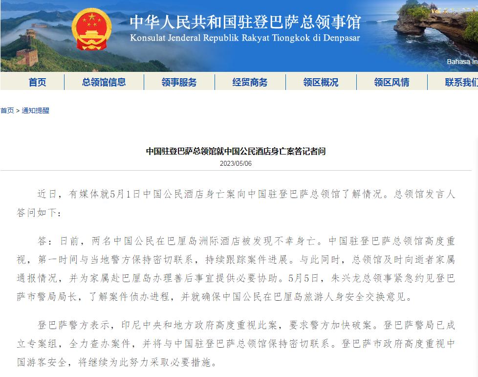 答:日前,兩名中國公民在巴厘島洲際酒店被發(fā)現(xiàn)不幸身亡。中國駐登巴薩總領(lǐng)館高度重視,第一時間與當(dāng)?shù)鼐奖3置芮新?lián)系,持續(xù)跟蹤案件進展。與此同時,總領(lǐng)館及時向逝者家屬通報情況,并為家屬赴巴厘島辦理善后事宜提供必要協(xié)助。5月5日,朱興龍總領(lǐng)事緊急約見登巴薩市警局局長,了解案件偵辦進程,并就確保中國公民在巴厘島旅游人身安全交換意見。