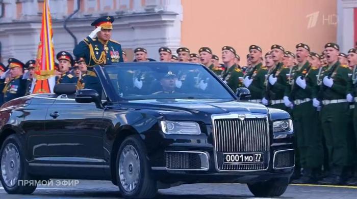 俄國(guó)防部長(zhǎng)紹伊古乘車檢閱。圖片來源:俄羅斯第一頻道視頻截圖
