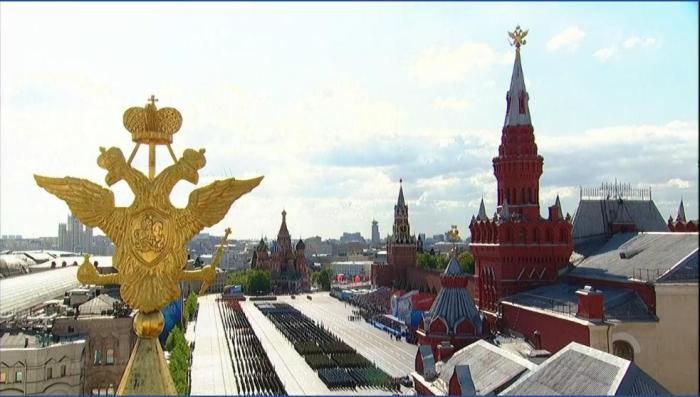 今年紅場(chǎng)閱兵的空中部分取消,最后一列軍事裝備沿著紅場(chǎng)行進(jìn)完畢后,軍樂隊(duì)奏響《勝利》樂曲。莫斯科時(shí)間11時(shí)左右,紅場(chǎng)閱兵式在“烏拉”聲中結(jié)束。