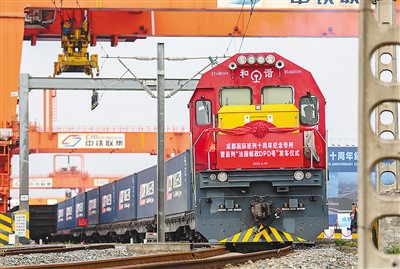 中歐班列是中法進(jìn)出口貿(mào)易的重要橋梁。圖為4月26日,為紀(jì)念成都國(guó)際班列十周年而開(kāi)行的“法國(guó)郵政DPD專(zhuān)列”在四川省成都市青白江區(qū)國(guó)際鐵路港首發(fā)。