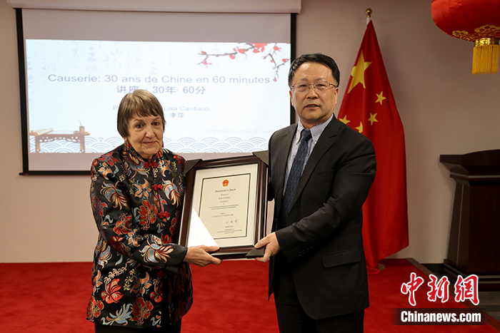 中新社蒙特利爾5月14日電 (記者 余瑞冬)加拿大著名作家、詩人、漢學(xué)家李莎·卡爾杜齊(Lisa Carducci)13日在中國駐蒙特利爾總領(lǐng)事館獲頒中國駐加拿大使館2022年度“大使獎(jiǎng)”。