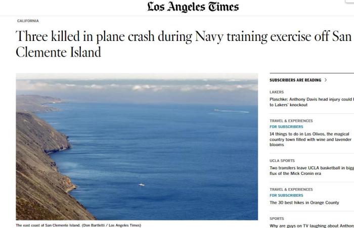 報(bào)道稱(chēng),其中一架載有三人的“利爾”噴氣式飛機(jī)從穆古角海軍航空站起飛,后與空中交通管制員失去聯(lián)系。美國(guó)海岸警衛(wèi)隊(duì)發(fā)言人李維·里德(Levi Read)隨后證實(shí),這架飛機(jī)于10日上午7時(shí)55分左右墜入太平洋。另一架飛機(jī)安全著陸。