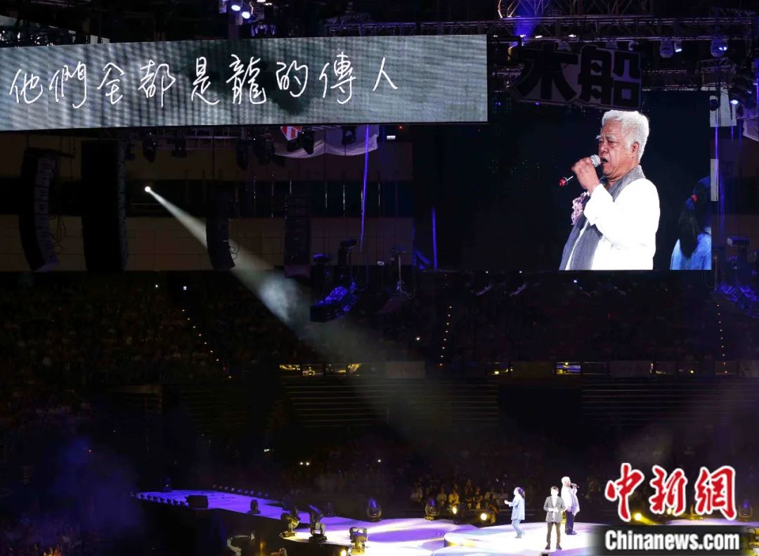 2015年6月,“民歌40:再唱一段思想起”演唱會在臺北小巨蛋舉行。包括齊豫、李宗盛、潘越云在內(nèi)的幾十位知名歌手齊聚一堂,共同紀念臺灣民歌運動興起40周年。圖為胡德夫等人合唱《龍的傳人》。鄭巧 攝