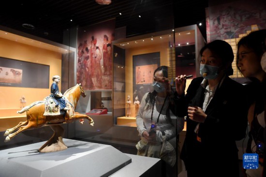 5月8日,游客在西安博物院參觀唐代三彩騰空馬。飛騰的三彩馬上騎有一胡俑,真實再現(xiàn)了絲綢之路上西域胡人急奔長安的生動形象。