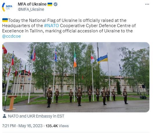 烏克蘭外交部在推特上發(fā)布圖片并配文稱,“今天,烏克蘭國(guó)旗在位于塔林的北約合作網(wǎng)絡(luò)防御卓越中心總部正式升起,標(biāo)志著烏克蘭正式加入該組織。”