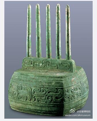 云紋銅五柱器曾引發(fā)廣泛關(guān)注,其外形酷似現(xiàn)代的路由器。在安徽博物院官網(wǎng)可以看到,這件文物名為“云紋銅五柱器”,斷代為西周。其用途待考。