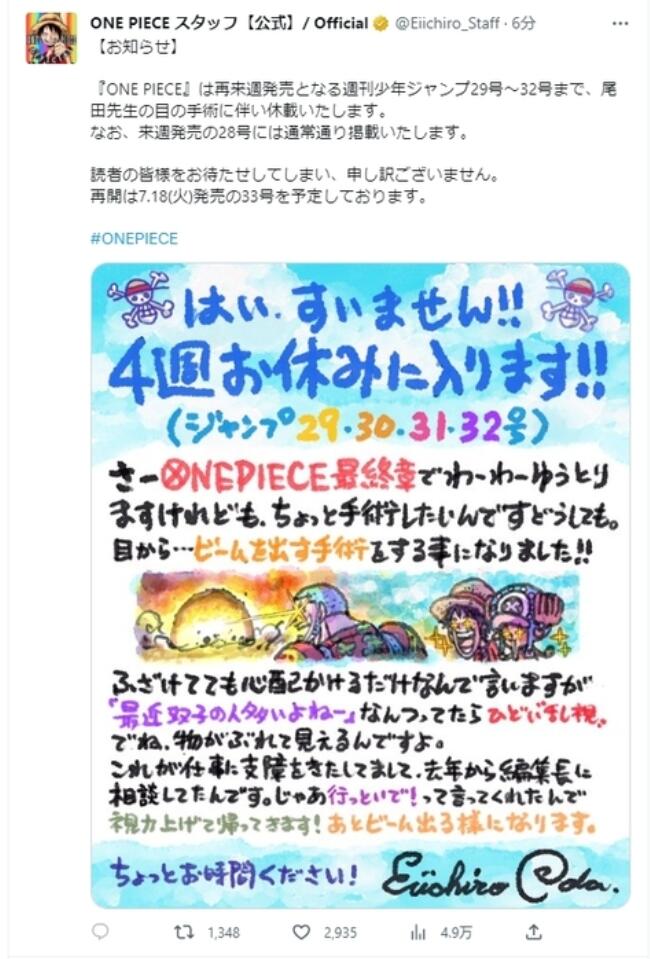 其官網(wǎng)還發(fā)布了尾田榮一郎在自己的手繪插畫上寫的“請(qǐng)假條”。他表示:“非常抱歉,我將休息四周時(shí)間?!逗胶M酢冯m然已經(jīng)進(jìn)入終章,但由于眼睛的散光很嚴(yán)重,看東西時(shí)出現(xiàn)重影,所以需要做個(gè)手術(shù)。請(qǐng)給我一些時(shí)間(修養(yǎng)一下)。”