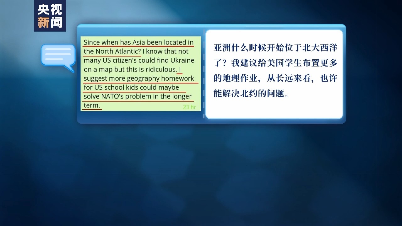 “亞洲什么時候開始位于北大西洋了?我建議給美國學生布置更多的地理作業(yè),從長遠來看,也許能解決北約的問題?!?/p>